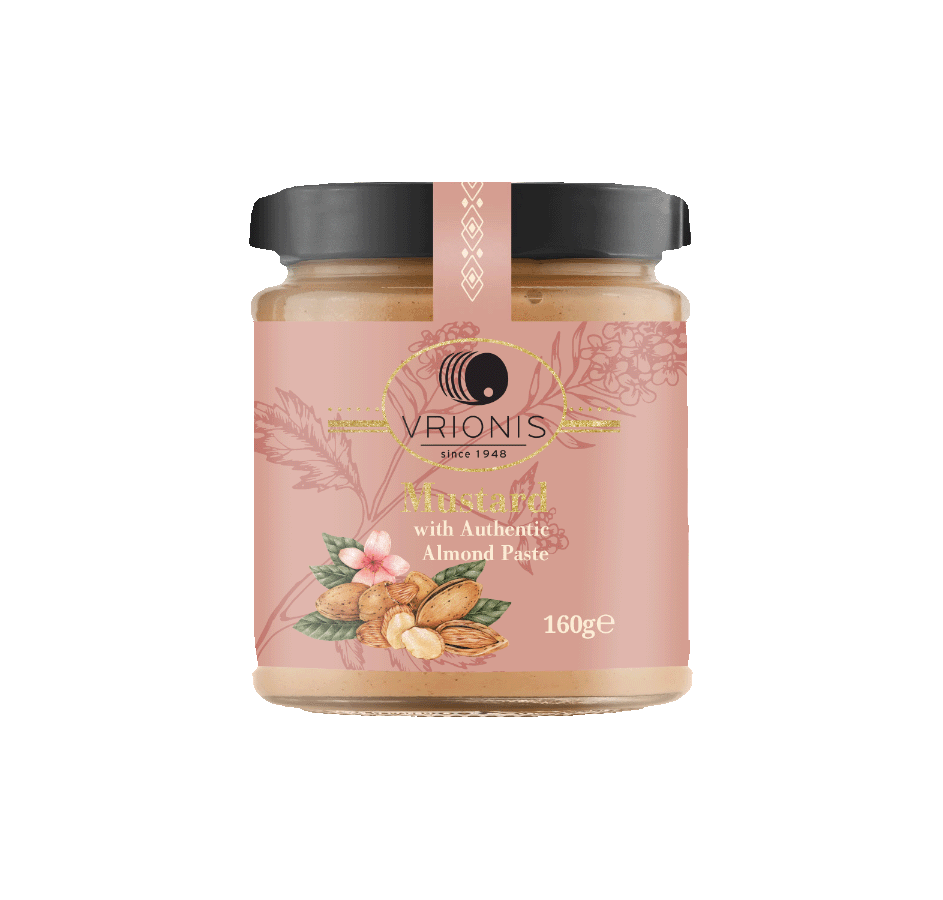 The wide variety of Vrionis’ mustards has been crowned with almond flavor – the absolute master in the kitchen. Almond paste not only enhances the taste of mustard seeds but renders new fragrance with a characteristic hue suitable for any part of the daily menu.